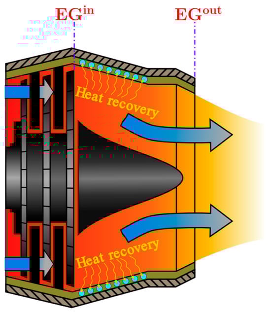 For the recovery heater subunit, a possible design is presented in Figure 3. This configuration is included for illustrative purposes only and will neither be designed nor modelled in this preliminary analysis. In this concept, the high-temperature EGs exiting the turbine () transfer heat to N2 flowing through a serpentine tubular pipe. This pipe, integrated into the structure of the outlet nozzle, acts as the recovery heater subunit. After transferring their heat to the N2, the EGs are discharged into the atmosphere (.