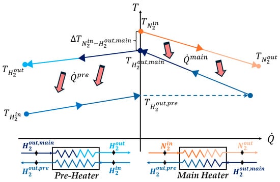 Specifically, to solve these equations, the CoolProp libraries are used to calculate the enthalpies required for Equations (1) and (2). Once the enthalpies are obtained , ), CoolProp is used again to calculate the associated temperatures (, ), which are then used to determine the temperature profile inside the pipes (for both subunits). Figure 4 illustrates qualitatively the heat exchange process occurring in the pre-heater and main heater subunits.