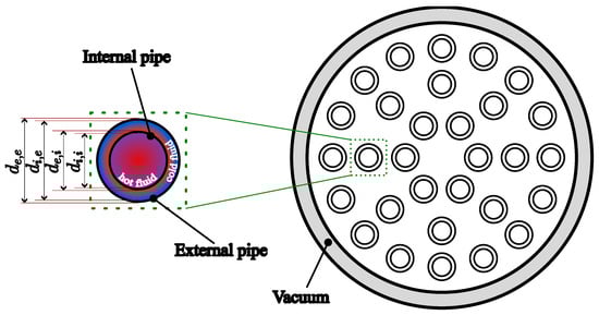 The technology at the core of this study is the pipe-in-pipe technology, where the internal pipes are enclosed within the external ones. In both heat exchanger subunits, the hot fluid flows inside the internal pipe, while the cold fluid circulates in the space between the internal and external pipes. This configuration offers advantages in terms of compactness and reduced system weight. The system geometry is shown in Figure 5 where represents the internal diameter of the internal pipe, represents the external diameter of the internal pipe, represents the internal diameter of the external pipe and represents the external diameter of the external pipe. The authors are unaware of any previous market applications of this technology, making it a novel proposal. The number of pipes () is the same for both the main heater and pre-heater subunits.