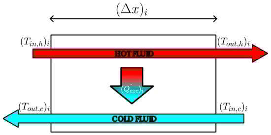 where and represent the outlet temperature and the inlet temperature of the generic cold fluid. A single module can be schematically represented in Figure 6, where , , , and are the input and output temperature for the hot fluid, the input and output temperature for the cold fluid, and the length of the i-th module, respectively.