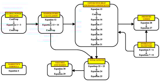 The model is structured into three main parts: first, the temperature calculations are detailed (Section 3.1); second, the heat transfer coefficients are described (Section 3.2); and finally, the heat exchanger key performance parameters are characterised (Section 3.3). A schematic representation at the end of this section summarises the flow of calculations and parameter interrelations.