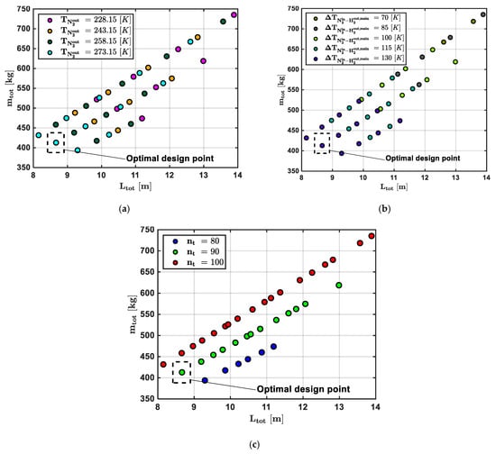 The results, showing the influence of these input variables (, ) and () on the performance parameters ( and ) are presented in Figure 8, which highlights the selected optimal design point. The analysis reveals that higher values of the thermodynamic variables ( and ) combined with intermediate values of the geometric variable () effectively minimise both the total length () and mass () of the heat exchanger. Based on this, the optimal design point has been selected with = 273.15 K, = 130 K and = 90. Table 9 specifies the thermodynamic and geometric input variable values corresponding to the optimal design point.
