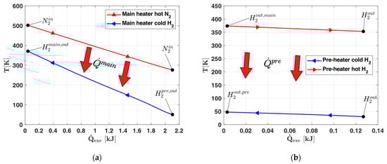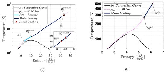 With the thermodynamic data for the heat exchange in both subunits fully determined, the trends of the thermodynamic states of H2 and N2 throughout the pre-heater and main heater subunits can be analysed. Figure 9 illustrates these thermodynamic transformations for both fluids on a temperature–entropy (T-s) diagram, with Figure 9a detailing the transformations for H2 and Figure 9b for N2. It is evident that no two-phase or cyclic behaviours occur during heat exchange, as both fluids are handled at supercritical pressure values.