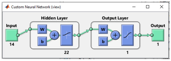 Artificial neural network (ANN) is a model inspired by nerve cells’ structure and working logic, which play an important role in the nervous system of living beings [20]. ANN is a method that produces successful results in many fields, from transportation to health and education to commerce. The ANN model is an integrated structure that consists of input, output, and hidden layers. In an ANN model, the data transmitted to the output layer is processed within the scope of certain requirements in the input layer. To obtain a successful response, the connection strength and weight are adjusted according to the input results [21]. In the ANN structure, each layer has independent neurons belonging to its own layer. Also, these neurons are connected to all neurons in the next layer. Different weight values make the connections between these neurons. They are called synaptic weights in the literature [22,23]. Generally, the results obtained by multiplying each of the inputs by the weight are simply summed with the threshold value. Then, they are processed with the activation function to create a suitable result, and the output data are obtained. Therefore, the learning ability of an artificial neuron cell depends on the appropriate adjustment of weights within the chosen learning algorithm [24].