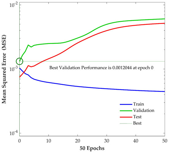 In this study, 1000 iterations are used in the training of ANN. The network training process is completed in 50 iterations. The lowest mean square error (MSE) value is reached in the third iteration. According to Figure 2, the MSE value is 0.0012044 in the work. Figure 3 shows the average error values of the training, validation, and test data used in the ANN model over 50 iterations. According to these results, it is understood that the training studies of ANN achieved a success level, which is very close to the best situation. Moreover, higher success rates are achieved in testing and validation studies, too. As a result of this study, within the framework of the existing data and the based method, functions, structure, and all parameters, the model has achieved a success rate of 0.98616% in training studies and a success rate of 0.99366% in test studies. Furthermore, the ANN has approached a success level of 0.98782% in all studies and 0.99007% in validation.