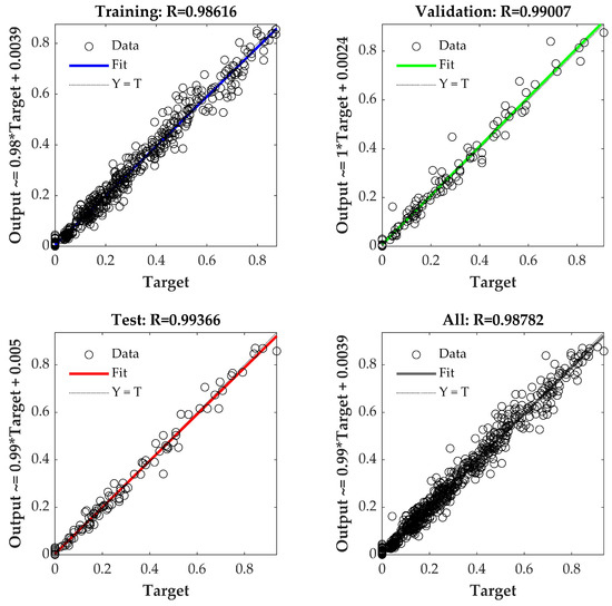 Some statistical criteria compare the results of studies conducted with artificial neural networks. Estimating the quality of performance success between networks is possible by looking at the minimum error rate. For this purpose, the Root Mean Square Error (RMSE) method is recommended as a criterion [46]. The MAPE value eliminates the negative effects of comparing models of different unit values. It is known that the use of the MAPE method is more popular among performance measurements in these types of models. This is because this model expresses the estimated error values in percentage form. So, it eliminates the possible deficits for comparisons of models with varied unit rates because it states the prediction errors comparatively and the number of data or minority of the observation values are not generally important in this method because the produced results are relative [47]. A high linear relationship between the real value and the estimated value is manifested by high R2 and low RMSE and “cov” measurements. While smaller values of RMSE and covariance (cov) indicate higher accuracy of predictions, the larger R2 value indicates a higher linear relationship between predicted and measured values [48].