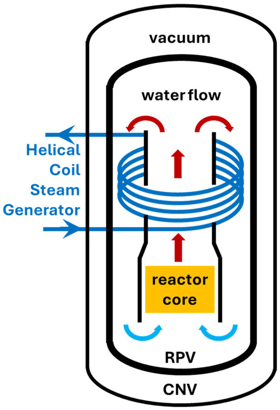 Schematic representation of the NuScale module. The module combines a reactor pressure vessel (RPV), a helical coil steam generator, and a containment vessel (CNV), and is immersed in a water pool.