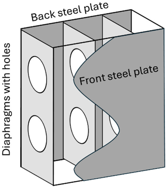 Schematic diagram of a composite wall made of steel plates with diaphragms, where concrete fills the gap between the steel plates.