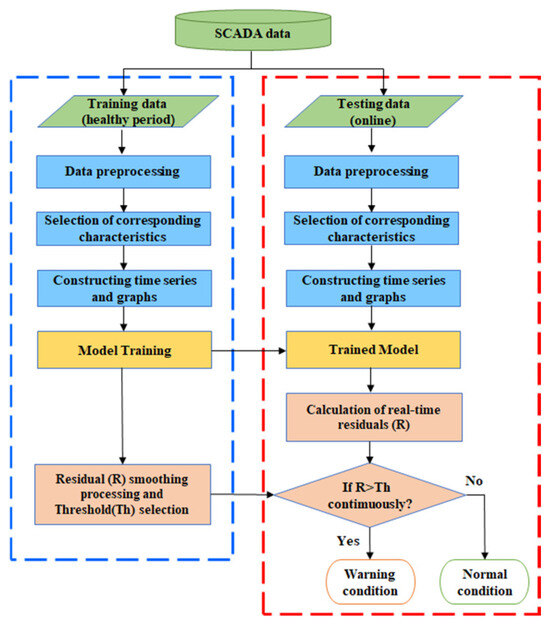 Wind energy, as a green, low-carbon, and economical source of energy, is highly recognized globally. According to the “2024 Global Wind Report”, the global installed wind power capacity reached a record 117 GW in 2023, representing a 50% increase compared to 2022. By the end of 2023, the total global installed wind power capacity reached 1021 GW, an increase of 13% year-on-year [1]. Despite continuous improvements in the design and manufacturing processes of wind turbines (WTs), the failure rate remains high due to their long-term operation under varying conditions and harsh environmental factors. As a result, the operation and maintenance (O&M) issues of WTs have attracted widespread attention [2]. According to statistics, the O&M cost of onshore WTs accounts for 10–15% of the total generation cost, while the proportion for offshore WTs is about 20–25% [3,4]. These high O&M costs impose a heavy burden on wind farm operators. Therefore, it is necessary to develop an efficient and accurate WTCM model capable of detecting abnormal conditions in a timely manner, helping operators adjust O&M strategies, reduce downtime, and lower maintenance costs.