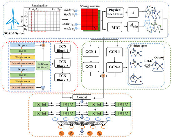 - To further represent the relationships between different parameters in SCADA data, a graph-based modeling method for SCADA time series data is proposed. The SCADA data are abstracted into a graph node feature matrix and an adjacency matrix. Based on the operational mechanisms of WTs, a static graph adjacency matrix with physical mechanisms is constructed. The maximal information coefficient (MIC) is used to quantify the dynamic relationships in the graph node feature matrix, resulting in an adaptive dynamic graph adjacency matrix.