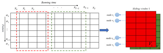 Consider a multivariate time series X = {x1, x2, x3, …, xT}, where T represents the length of the time series and Xi denotes the feature vector at time step i. The sliding window method is applied to process the time series X. A sliding window of length l divides the long sequence X into w equal-length subsequences V = {V1, V2, V3, …, Vi, …, Vw}. For each subsequence Vi ∈ Rn×l, a feature graph is constructed, as shown in Figure 3. In this process, each sensor in the WT is treated as a node, and the relationships between sensors are abstracted as edges between nodes. Here, V ∈ Rn×l represents the node feature matrix, where n is the number of nodes (i.e., the number of sensors) and l is the feature length, corresponding to the length of the input time series. E represents the set of edges connecting these nodes. The relationships between the nodes form an N × N adjacency matrix A. In this paper, two types of adjacency matrices are constructed; one is a static adjacency matrix, obtained by analyzing the operational mechanisms of the wind turbine, and the other is a dynamic, adaptive adjacency matrix, derived from the MIC of the feature graph.