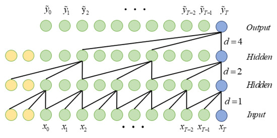 d is the dilation factor, which typically grows exponentially by a factor of two as the network depth increases, k is the size of the convolution kernel, and represents the past direction. The structure of dilated causal convolution is shown in Figure 5. In the figure, the dilation factor d = 1, 2, 4 and the convolution kernel size k = 3 ( is the input at time and is the output at time ).