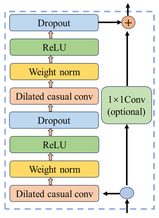where is the output, is the activation function, and represents the residual features. Figure 6 shows an example of a residual block. The TCN [39] is composed of two stacked sub-modules, each of which includes four network layers, comprising a dilated causal convolution layer, a weight normalization layer (Weight Norm), an activation function layer (ReLU), and a regularization layer (Dropout).