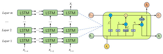 Due to its unique design, LSTM has demonstrated exceptional performance in processing time series data, gaining extensive attention and improvements in academia. The core of the LSTM network lies in its unit structure, which includes three key gating mechanisms, namely the input gate, output gate, and forget gate [41]. The architecture of the LSTM network and the basic unit structure are shown in Figure 7. The equations representing the LSTM unit are as follows: