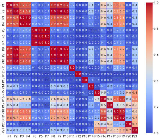 The SCADA system records hundreds of operational parameters during the operation of WTs. If all variables are directly input into the model, the reliability of the model’s predictions will be significantly reduced. Selecting appropriate input parameters helps improve prediction accuracy and accelerates convergence. The Pearson correlation coefficient is a method for measuring the linear relationship between two variables. In this study, we are dealing with time series data, and the Pearson correlation coefficient is particularly suitable for exploring the linear relationships between different features in time series data. Furthermore, compared to other methods such as mutual information and the Spearman correlation coefficient, it is simple, intuitive, and easy to implement. Therefore, the Pearson correlation coefficient (PCC) is used to calculate the correlation between feature variables, and those with higher correlation to the target parameter are selected as model inputs. The PCC defines the ratio of the covariance between two variables to the product of their standard deviations [27], as shown in Equation (2). The absolute value of the PCC is less than or equal to one, and the closer the absolute value is to one, the stronger the correlation between the two feature variables.