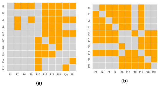 By quantifying the relationships between variables from both the mechanical transmission and temperature effect perspectives, a static adjacency matrix is constructed, as shown in Figure 9a. The MIC calculated in Section 3.1.2 is used to measure the correlation between variables at different time periods, reflecting the dynamic characteristics of variables across different periods, thus forming an adaptive dynamic adjacency matrix, as shown in Figure 9b.