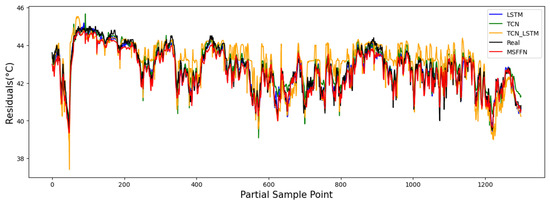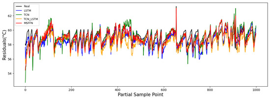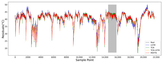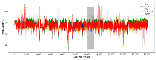 Figure 13 presents the gearbox oil temperature prediction results for Turbine 3 in a healthy state, showing the performance of four different models on the validation set. Figure 14 provides an enlarged view of the oil temperature prediction for the WT in the shaded area of Figure 13. From the zoomed-in view, it can be observed that the actual gearbox oil temperature exhibits periodic increases followed by linear drops over a certain period. The predictions of the MSFFN model align more closely with the actual fluctuation characteristics compared to the other models. Table 7 presents the evaluation metrics for the predictive performance of the different models. In terms of prediction performance, the proposed model outperforms the others. Specifically, the RMSE, MAE, and MAPE of the proposed model are reduced by 17.61%, 23.92%, and 10.08%, respectively, compared to the optimal metrics of the other models, while the R2 increment of the proposed model is 1.6% higher than that of the best-performing model.