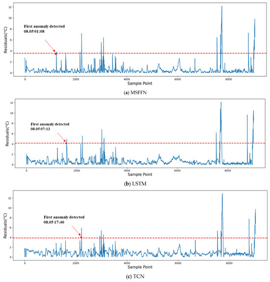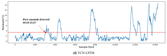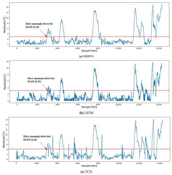 Fault warning analysis was conducted on the test set, where the residuals of the predicted gearbox oil temperature were smoothed using the EWMA method. An alarm is considered triggered only when the residual continuously exceeds the threshold for 30 min. Figure 12a,b,c, and d respectively present the warning information of different models on the test set. As shown in the figures, the residuals fluctuate within the threshold during the early stages of prediction. However, when an early fault occurs in the wind turbine, the residuals exhibit a rapid increase over a short period and persistently exceed the threshold. The MSFFN model issued its first warning on 5 May 2017 at 13:49, providing a lead time of 188.6 h before the turbine’s fault-induced shutdown. In comparison, the LSTM, TCN, and TCN-LSTM models issued warnings 186.53 h, 187.92 h, and 187.3 h prior to the fault, respectively. The MSFFN model demonstrated an earlier warning capability by 41 to 124 min compared to the other models.