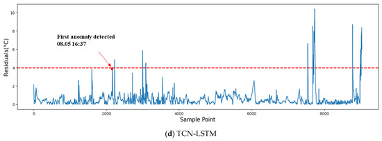 Fault warning analysis was conducted on the test set using the same approach as described in Section 4.4 for the temperature control valve fault. Figure 15a, b, c, and d respectively present the warning information of different models on the test set. As seen in the figure, the prediction residuals initially fluctuate slightly within the threshold range. After the turbine experiences an early fault, the residuals rapidly rise for a short period and consistently exceed the threshold, remaining in the fault alarm state for an extended period before the fault shutdown. The MSFFN model issued its first warning at 01:08 on 5 August 2017, 133.67 h in advance of the turbine fault shutdown. The LSTM, TCN, and TCN-LSTM models issued warnings 124.83 h, 113.83 h, and 114.88 h before the fault, respectively. Compared to the other models, the MSFFN model issued the warning 6.08~16.6 h earlier, further demonstrating the superiority of the proposed method.