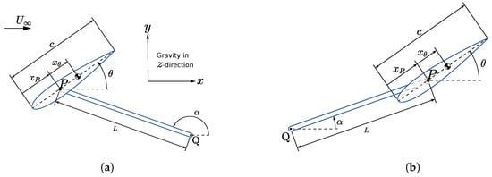 where L is the length of the swinging arm, is the pitch angle of the foil, is the angular position of the arm, is the stiffness of the foil’s spring at point P, is the stiffness of the arm’s spring at point Q, is the coefficient of the foil’s damper at point P, is the coefficient of the arm’s damper at point Q, is the moment of inertia of the foil measured at point P, is the combination of the mass moment of inertia of the arm measured at point Q and the added mass m of the foil at the end of the arm, i.e., , S is the static imbalance taking into consideration the displacement of the foil’s center of mass from point P, i.e., , M is the hydrodynamic torque acting on the foil, and are the hydrodynamic forces acting on the foil, is the fluid density, is the freestream velocity, c is the foil’s chord length, and b is the foil’s span length. For a 2D analysis such as this one, the foil’s span length is considered to be equal to unity for normalization purposes, and hydrodynamic forces on the arm are neglected.