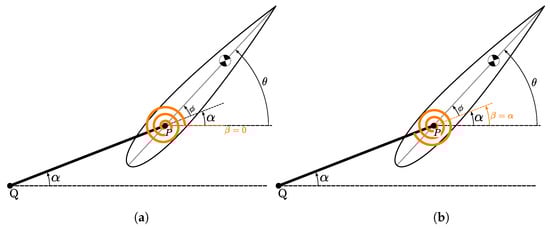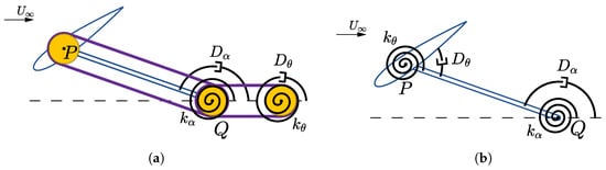The damper and spring positions are illustrated in Figure 3a,b. In Figure 3a, the pitching spring and damper were moved to a second set of gears and chain to facilitate comprehension, but in practice, they could easily be superimposed on those at point Q without affecting the dynamic equations. As is clearly shown in Figure 3b, the pitching spring and damper are directly mounted on the swinging arm. One can thus observe that the resting position of the foil, for instance, when it is allowed to freely oscillate in a vacuum, is when the foil is parallel to the arm. With the configuration of Figure 3a, however, the pitching spring and damper are now fixed to the horizontal reference, making the resting position of the foil aligned with the horizontal and, therefore, with the flow.