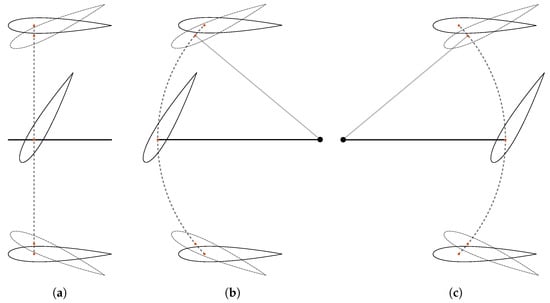When the system is gearless, the pitch spring is directly mounted upon the foil and the arm. In such a case, the equilibrium position of the foil is where the foil is parallel to the arm, i.e., , as is shown in Figure 2a. In any other angular position, a torque is then applied by the pitch spring on the foil. From Newton’s third law, an equal and opposite torque is therefore applied on the arm. This can be seen in Equations (3a) and (5a) where the terms involving the pitch damper and pitch spring are present when the system is gearless, but are absent in Equations (4a) and (6a) when the system is geared.