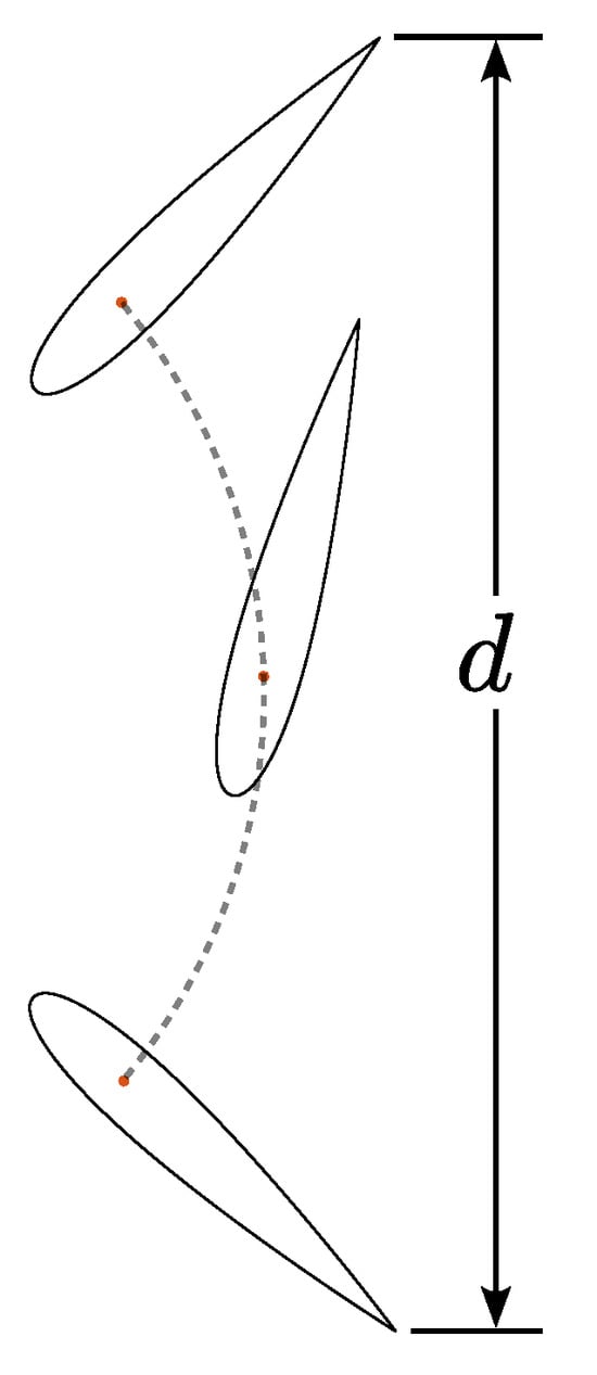 where d is the overall height of the power extraction window calculated from the highest and lowest points reached by any part of the foil during a cycle from the combined effect of both the heave and pitch amplitudes (see Figure 5).