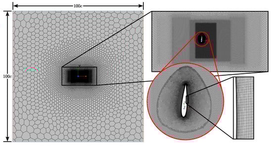In this study, the background mesh forms a square with side lengths of 100 cords containing 49,291 hexagonal cells (see Figure 6). In the center of this square are zones of progressively increasing refinement. An overset mesh containing a NACA 0015 foil is placed in the most refined zone. The overset mesh is made of 29,323 cells and has 500 nodes placed around its periphery. It was verified that the value is everywhere close to unity during a statistically converged cycle. Both meshes are combined using an overset mesh feature integrated in STAR-CCM+®. At the inlet (left border), a uniform velocity profile along with a uniform turbulent viscosity ratio is applied. This viscosity ratio follows the recommendation by [] to ensure that the Sparlart-Allmaras turbulence model operates in its fully turbulent mode. Additionally, a zero-gauge pressure is applied on the outlet (right border), and symmetric conditions are applied on the upper and bottom borders of the domain. For all simulations, the time step used is such that . This represents at least 1000 time steps per cycle for all simulations carried out. Table 2 shows the main performance metrics obtained in the current study for the railed configuration operating under the coupled-flutter instability and their values obtained by Boudreau et al. [], showing very good agreement between the two and giving a high degree of confidence that the swinging arm results obtained in this study are trustworthy. An experimental study has also been carried out by Boudreau et al. [] to validate the numerical simulations of Veilleux and Dumas [], showing good agreement between the numerical and experimental results.
