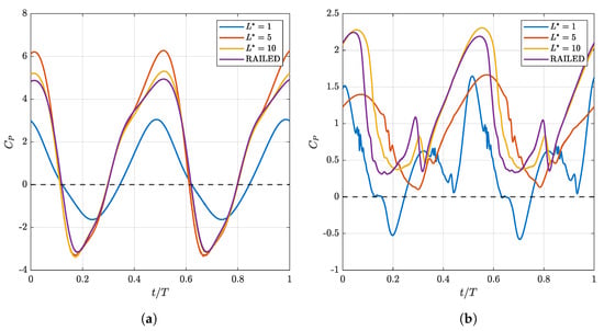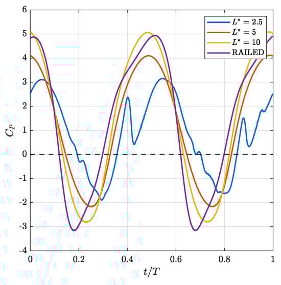 As stated in Section 2.1, the longer the arm, the more the foil’s motion will become similar to that of the railed FP-OFT. Inversely, shorter arms will make the foil trace an arched trajectory. Thus, to cover small to moderately long lengths of the arm (normalized with the chord of the foil), the following values were chosen: , and 1000. The last two very large lengths, i.e., 100 and 1000, which are obviously impractical choices for building prototypes, were chosen to validate the fact that as , the performances of all configurations tend to those of the railed FP-OFT. This can be observed in Figure 7, where the instantaneous power coefficient of the FP-OFT-SA is shown during a complete cycle as a function of the dimensionless length of the arm operating under the coupled-flutter and the stall-flutter instabilities.