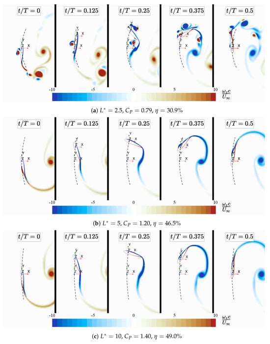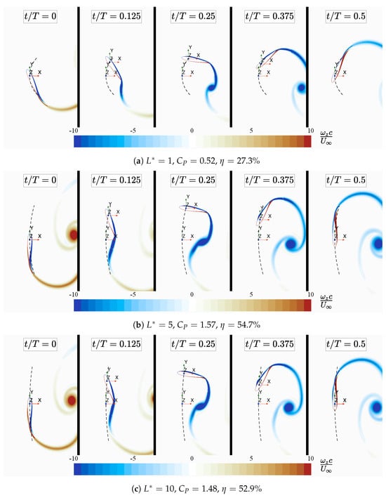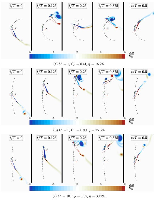 As increases, the curves fall back to the railed FP-OFT curve. This can be observed in Figure 8 and Figure 9, which show the normalized vorticity field of half a cycle of the cases shown in Figure 7, as well as the arched trajectory with smaller values of . The vorticity fields also show the different vortex shedding patterns between the coupled-flutter and the stall-flutter parameters. Note that, in some instances, additional arm lengths in the small-to-moderate range have been analyzed in order to add resolution in some regions of the performance metrics’ curves.