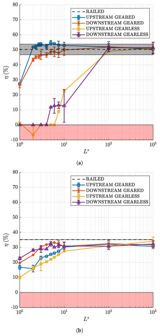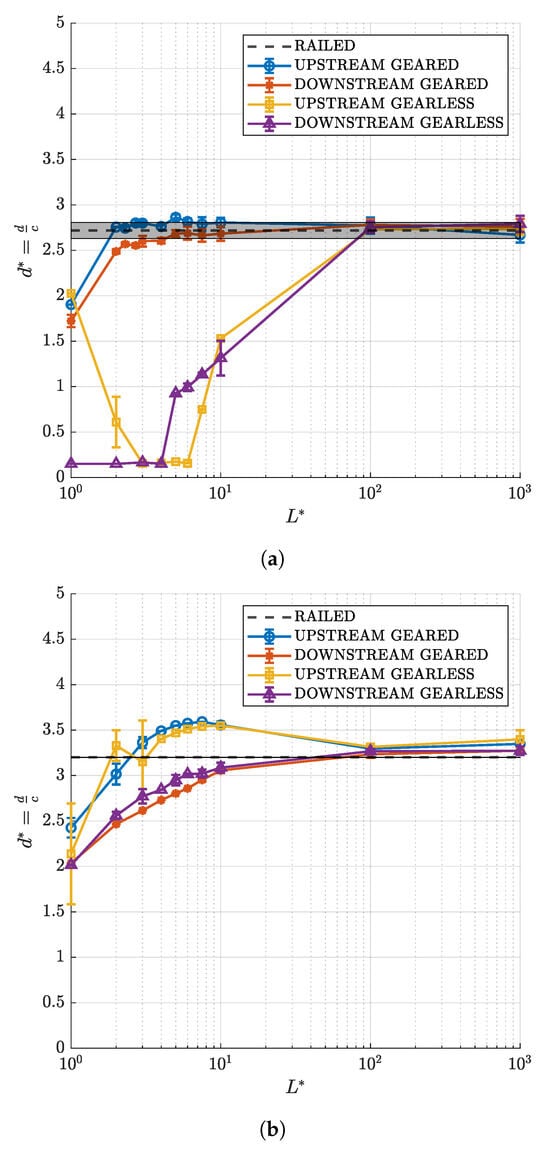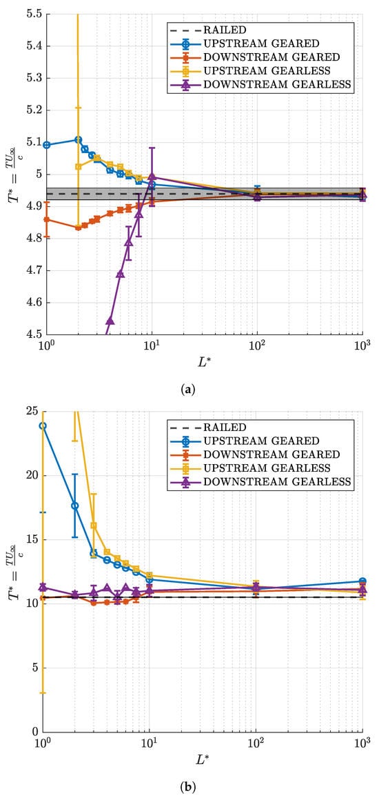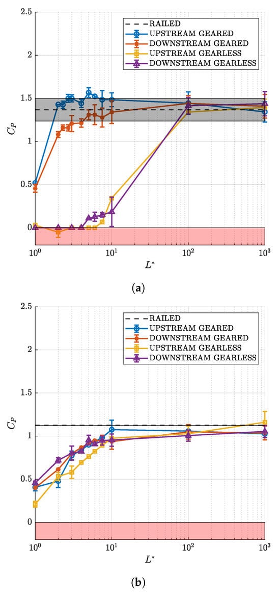 For the oscillation period in the stall-flutter configuration, Figure 12b shows that in the downstream geared and gearless configurations, the period is nearly constant for all lengths analyzed, showing here again the robustness of the stall-flutter instability. For the two upstream configurations, the period tends to diverge from the railed configuration value for shorter arms, with larger error bars denoting strong erratic behavior at small arm length values. Indeed, even if Figure 11b shows an efficiency value of around at for the upstream gearless configuration, Figure 12b shows that the turbine has a much longer period with large error bars.