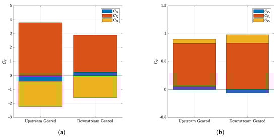 Moreover, as opposed to the coupled-flutter turbine, Figure 11b shows that the most efficient configurations operating under the stall-flutter instability are not related to the use of gears. Indeed, the two best configurations are the downstream configurations, with and without the use of gears. Here, the same argument as in the coupled-flutter instability configuration holds true: the horizontal component of the force tends to increase the extraction window in the upstream configuration and to reduce it in the downstream configuration. However, the upstream coupled-flutter turbine had a higher than its downstream counterpart because of the added power in the heave motion from the larger window. For the stall-flutter case, Figure 10b shows that the is rather unaffected by the upstream or the downstream configuration, with all four curves being more or less coincident. Figure 14b corroborates this idea, showing that the power coefficient in the heave motion is sensitive to a small degree to the upstream or downstream position in the stall-flutter case.