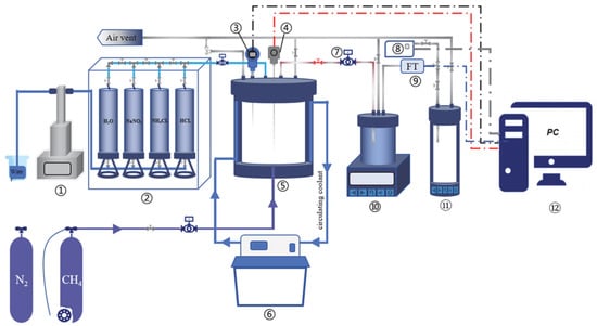 Figure 1 depicts the experimental system for methane hydrate generation and decomposition, which consists of five parts. The autoclave reaction system (25 ± 0.05 MPa, −25–100 °C, 0.86 L) is made of Hastelloy. The multiphase fluid injection system uses a PID pressure controller (≤20 ± 0.05 MPa, TY901) to keep the gas injection and liquid injection pressures constant with a constant-speed double-cylinder pump (ISCO 1000D, Teledyne Isco, Thousand Oaks, CA, USA). The low-temperature circulating cooling system consists of a cooling circulator (HWY-30, Hebei Zhongxin, Hebei, China, high- and low-temperature water baths) and a cooling jacket to ensure that the temperature of the autoclave remains constant at a low temperature; the multiphase fluid separation and gas collection system consists of a gas–liquid separator (JT-LV, Hangzhou JT, Hangzhou, China, 2.2 L, ±2%~±3%), a gas collection device (with pressure and temperature detection functions, 3.8 L), and a gas chromatograph, and it uses a PID pressure controller to control the outlet pressure at the preset pressure for the experiment. The data acquisition system collects and aggregates the data obtained by a pressure transducer (±0.5%FS), temperature transducer (±0.2 °C), gas chromatograph (<2%), and gas flowmeter (±0.25%).