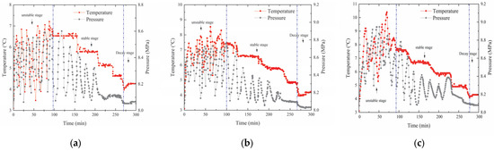 According to the changes in temperature and pressure in the reactor with time in Cases 1–6, the decomposition process was divided into three decomposition stages: the unstable stage, the stable stage, and the decay stage (regular changes are shown in Figure 2).