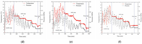 Curve of the relationships between pressure, temperature, and time for Cases 1–6. (a) Case 1; (b) Case 2; (c) Case 3; (d) Case 4; (e) Case 5; (f) Case 6.