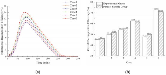Instantaneous decomposition efficiency and overall decomposition efficiency in Cases 1–6. (a) Instantaneous decomposition efficiency in Cases 1–6. (b) Overall decomposition efficiency in Cases 1–6.