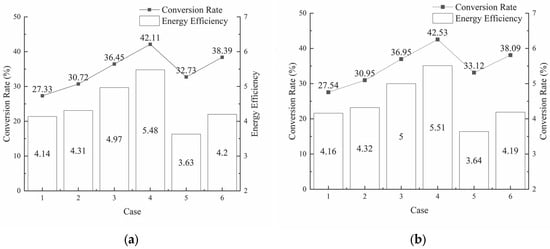 Chemical reaction system conversion and methane energy efficiency changes in Cases 1–6. (a) Experimental group; (b) parallel sample group.