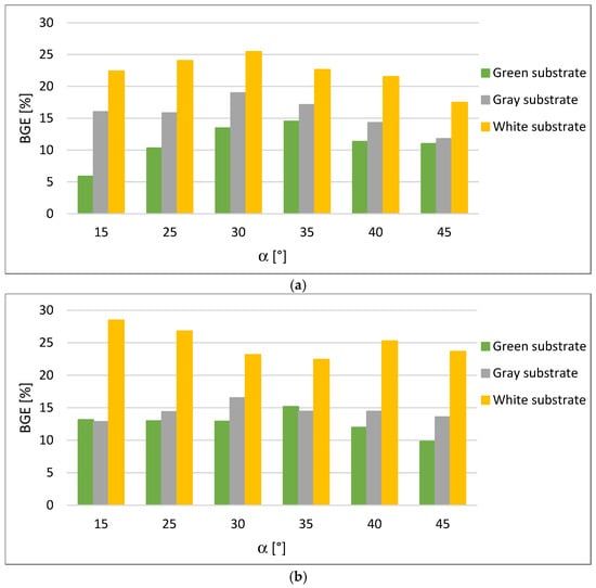 Comparing the BGE values for various substrates and individual mounting heights, as shown in Figure 12, for low mounting heights, the angle of inclination is crucial—all substrates have this factor the highest for angles of 30–35°. Moreover, a substrate with a higher albedo has a higher BGE for each angle. Similar dependencies occur for higher assembly heights. The albedo is the dominant parameter here. The system with a white substrate has a much higher BGE, where in the remaining cases (green and gray substrates), these differences are definitely smaller, and in specific measurement conditions, the green substrate was characterized by a higher BGE than the gray one.