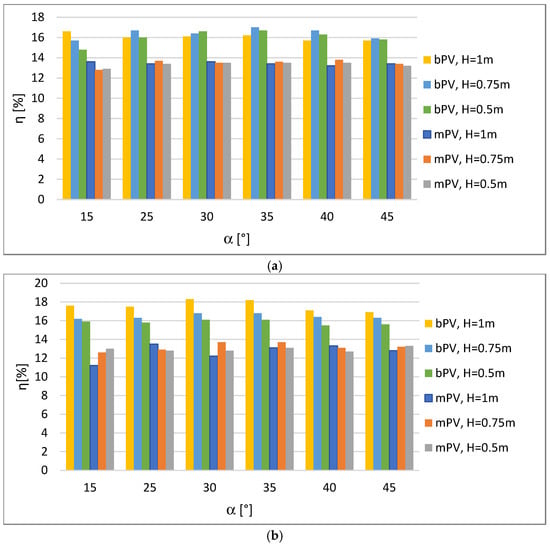 For all configurations of the mPV, the efficiency was similar and amounted to approx. 13.3%, and in the case of the bPV, this parameter was more varied and ranged from 14.8 for the angle of 15° to 16.7% at the angle of 35°.