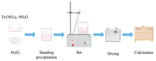 The iron-based OCs used were prepared from Fe(NO3)3·9H2O and α-Al2O3 by co-precipitation method. The masses of Fe(NO3)3·9H2O and α-Al2O3 were calculated based on a molar ratio of Fe2O3 to carrier α-Al2O3 of 6:4. The preparation procedure of iron-based OCs is shown in Figure 1. In a glass beaker, Fe(NO3)3·9H2O and α-Al2O3 were mixed together, and distilled water was added to the beaker and stirred well. The beaker was allowed to stand for 4 h and then placed in a water bath so the mixture could be stirred at 80 °C until no water was separated out. Then, the mixture was put into a blowing dry box under a constant temperature of 160 °C to be dried, and the drying time was 24 h. After this process, the oxygen carriers’ precursors were obtained. Finally, the oxygen carriers’ precursors were calcined at 900 °C in a muffle furnace for 6 h to obtain the samples of iron-based OCs. Oxygen carrier samples were pulverized into particles with particle sizes of 200–300 μm.