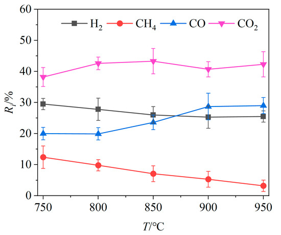 The influence of gasification temperature on chemical looping gasification is primarily reflected in its effects on the reaction rate and the extent of reversible reactions. Experiments were carried out at five different gasifier temperatures in the range of 750 °C–950 °C to investigate the effects of the gasifier temperature on the CLG of BSGs. The mass ratio of the OCs to BSGs was set as 1.0, and the flow rate of water vapor was maintained at 0.125 g/min.