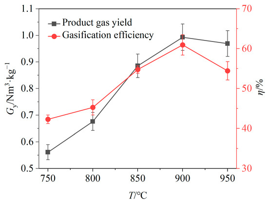 The impact of the gasification temperature on the gas yield and gasification efficiency is depicted in Figure 4. It is evident that both gas yield and gasification efficiency generally increase with a rising temperature. This suggests that high temperatures promote pyrolysis of solid products, gasification of carbon and reactions between the BSGs and OCs, leading to an increase in the relative volume fractions of gaseous products. When the temperature increased from 750 °C to 900 °C, the gas yield and gasification efficiency both exhibited upward trends, increasing by 0.44 Nm3/kg and 18.65%, respectively. However, when the temperature increased from 900 °C to 950 °C, both the gas yield and gasification efficiency declined, decreasing by 0.03 Nm3/kg and 6.50%, respectively.