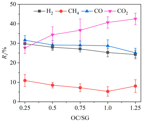 The variation in the relative volume fraction Ri of different gas components with OC/SG ratios is shown in Figure 5. The relative volume fractions of CO, H2 and CH4 in the product gas exhibited an overall decreasing trend, while the relative volume fraction of CO2 showed a corresponding increase as the OC/SG ratio increased. Specifically, when the OC/SG ratio was raised from 0.25 to 1.25, the relative volume fractions of CO and H2 decreased by 6.48% and 5.53%, respectively, while the relative volume fraction of CO2 increased significantly by 14.85%. The overall variation trend of the relative volume fraction of CH4 was also downward. These change laws can be attributed to the increase in the mass of the OCs with the rising OC/SG ratio, which enhanced the availability of oxygen for the CLG. This increased oxygen supply promoted chemical reactions between the OCs and combustible gases such as H2 and CH4 (Reactions (R3), (R5) and (R6)), leading to greater hydrogen consumption. Moreover, the additional lattice oxygen facilitated oxidation reactions of carbon and CO (Reactions (R1), (R2) and (R4)), resulting in a decrease in the relative volume fraction of CO as carbon-containing species were completely oxidized to CO2. Therefore, as the mass of the OCs increased, the relative volume fraction of CO tended to decrease, while the relative volume fraction of CO2 tended to increase. When the OC/SG ratio increased from 0.25 to 1.25, the value of QL also decreased from 11,716.63 kJ/kg to 9174.46 kJ/kg according to Equation (2).