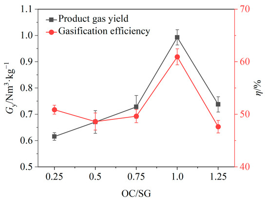 The effects of the OC/SG ratio on the gasification efficiency η and gas yield Gy are shown in Figure 6. When the OC/SG ratio increased from 0.25 to 1.0, Gy increased from 0.62 Nm3/kg to 1.0 Nm3/kg, and the gasification efficiency increased from 50.87% to 60.94%; when the OC/SG ratio increased from 1.0 to 1.25, there was a substantial decrease in the gas yield and gasification efficiency. It is evident that both the gas yield and gasification efficiency were relatively low when the OC/SG ratio was either below or above 1. When the OC/SG ratio was equal to 1, the gas yield and gasification efficiency both reached the maximum value. The reason may be that when the OC/SG ratio is less than 1, the mass of OCs is relatively low, which cannot provide enough lattice oxygen for the chemical looping gasification of BSGs, and the catalytic effects of OCs are not good, resulting in a low gas production rate [41]. However, if the OC/SG ratio exceeds 1, the excessive mass of the OCs may lead to an abundance of lattice oxygen, causing the chemical looping gasification process to transition into a combustion process, thereby increasing the CO2 content [42]. The experimental results indicated that an OC/SG ratio of 1 was optimal for the chemical looping gasification of BSGs. Consequently, subsequent experiments were conducted with the OC/SG ratio set to 1.