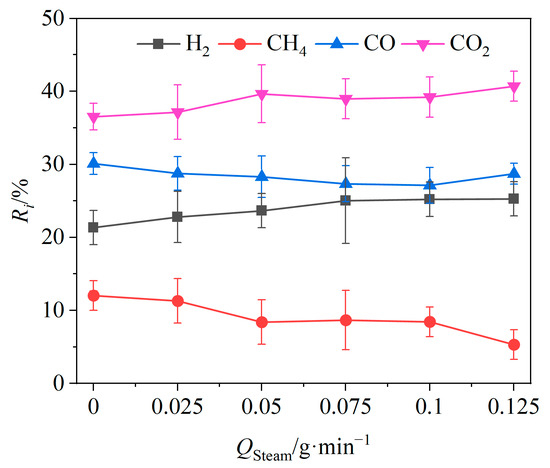 The effects of the vapor flow rate Qsteam on the relative volume fractions of the gas components are shown in Figure 7. When Qsteam was increased from 0 to 0.125 g/min, the relative volume fractions of CO2 and H2 showed an upward trend, increasing by 4.17% and 3.94%. The relative volume fractions of CO and CH4 showed a decreasing trend, decreasing by 1.39% and 6.7%, respectively. Higher steam flow rates promoted the producer gas reaction of carbon (Reaction (R7)) as well as reforming reactions of tar (Reactions (R10) and (R11)) and methane (Reaction (R12)), resulting in an increase in the relative volume fraction of H2 in the product gas. Meanwhile, the transformation of CO to CO2 was expedited by the intensified water–gas shift reaction (Reaction (R8)) due to the increased steam flow. Thus, higher steam flow rates yielded greater amounts of CO2 and H2.
