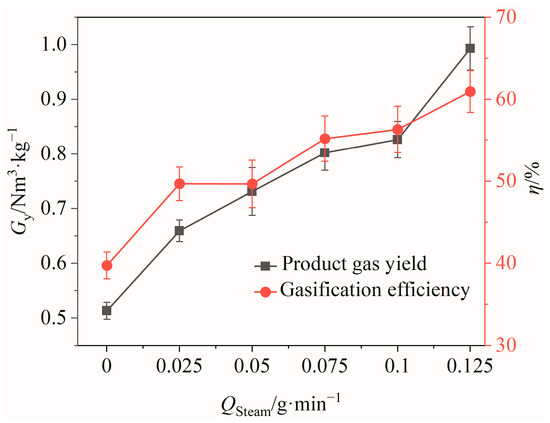 The effects of the steam flow rate Qsteam on the gas yield and gasification efficiency of the product gas are shown in Figure 8. It can be seen that with the increase in Qsteam, there was an increasing trend for both the gas yield and gasification efficiency. When Qsteam was increased from 0 to 0.125 g/min, the product gas yield and gasification efficiency increased by 0.48 Nm3/kg and 21.23%, respectively. This indicated that the BSG gasification reaction was more effective at higher steam flow rates, leading to a greater conversion of BSGs into gaseous products and an increase in H2 production. However, it is important to note that the steam flow rate cannot be elevated indefinitely, as steam generation requires energy. Considering energy consumption and utilization efficiency, a suitable steam flow rate of 0.125 g/min was ultimately selected for this study.