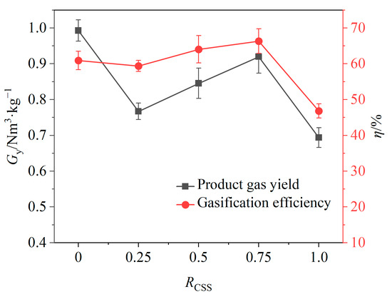 The effects of the weight ratio of CSSs in composite OCs on the product gas yield and gasification efficiency are shown in Figure 10. It can be seen that when the RCSS value was 0.5 and the relative volume fraction of H2 reached the maximum value, the gas yield and the gasification efficiency would increase with the further increase in the RCSS value, and the gasification efficiency reached the maximum value at the RCSS value of 0.75. It shows that the addition of CSSs can improve gasification efficiency. However, in order to meet the need of producing a high percentage of hydrogen, the RCSS value of 0.5 was finally selected as the optimal weight ratio of CSSs in composite OCs.