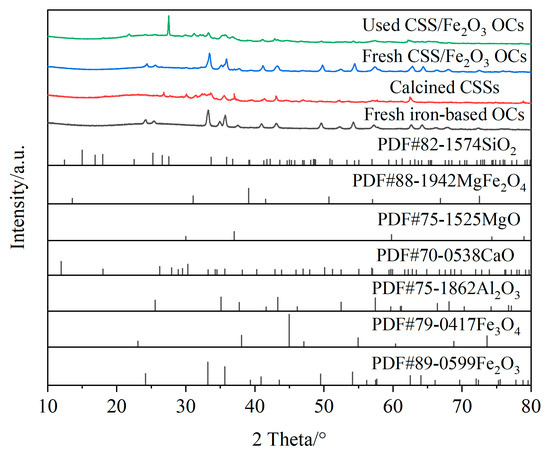 The phases present in different OCs or CSSs were determined by the X-ray diffraction (XRD) method. The XRD instrument type used in this study was Ultima IV. All samples were scanned at angles ranging from 10° to 80°. Among these, the fresh CSS/Fe2O3 composite OCs and used CSS/Fe2O3 composite OCs were mixed powders, which were scanned at a rate of 2°/min. The fresh iron-based OCs and calcined CSSs were scanned at a rate of 10°/min.