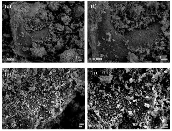 The SEM images of different OCs. (a) Fresh iron-based OCs (5000×), (b) fresh iron-based OCs (10,000×), (c) calcined CSSs (5000×), (d) calcined CSSs (10,000×), (e) fresh CSS/Fe2O3 oxygen carriers (5000×), (f) fresh CSS/Fe2O3 oxygen carriers (10,000×), (g) used CSS/Fe2O3 oxygen carriers (5000×) and (h) used CSS/Fe2O3 oxygen carriers (10,000×).