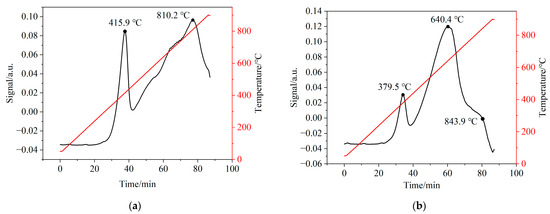 In order to investigate the interaction between CSSs and iron-based OCs, H2-TPR tests were performed to evaluate the chemical reactivity of CSS/Fe2O3 composite OCs. Figure 14 illustrates the H2-TPR patterns of iron-based OCs and CSS/Fe2O3 composite OCs. Figure 14a exhibits two reduction peaks at 415.9 °C and 810.2 °C for iron-based OCs, corresponding to the reduction of Fe2O3 to Fe3O4 and reduction of Fe3O4 to FeO, respectively. Figure 14b exhibits three reduction peaks at 379.5 °C, 640.4 °C and 843.9 °C for CSS/Fe2O3 composite OCs indicating the formation of new reduction centers or intermediate products that were ferrites of alkaline earth metals such as MgFe2O4. Compared to iron-based OCs, the CSS/Fe2O3 composite OCs exhibited a relatively lower temperature for the first reduction peak. This phenomenon was attributed to the catalytic effect of minor constituents such as CaO and MgO present in the CSSs, which significantly facilitated the reduction process of the OCs. The CSS/Fe2O3 composite OCs demonstrated a higher rate of hydrogen consumption, i.e., greater chemical reactivity, compared to the iron-based OCs. This observation might be attributed to the interaction between the alkaline earth metal oxides in CSSs and iron-based OCs.
